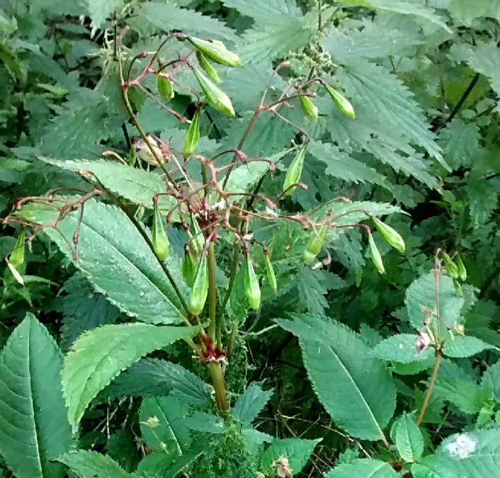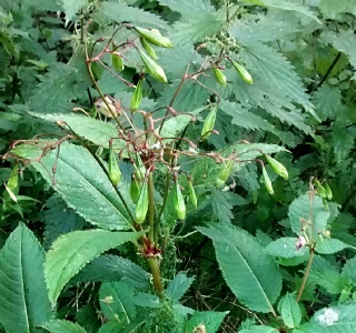 Each pod contains maybe half-a-dozen seeds. It explodes while still green and propels the seeds up to seven metres away. The seeds last around three years in the soil. If a seed falls into the river, it may be carried downstream and deposited on a low-lying river bank where it will start a new colony.