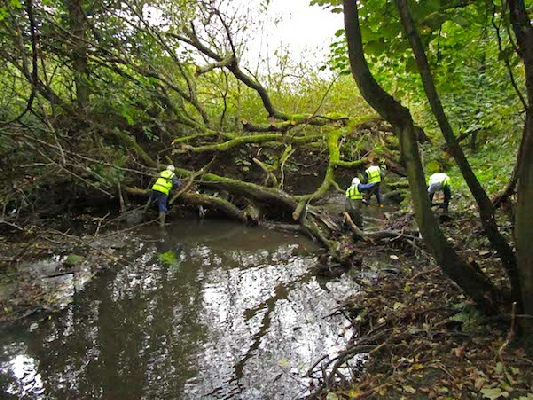 A “full house” work party of 12 volunteers descended on Crowhall Farm today to clear fallen trees from the river nearby. The conditions, it has to be said, were challenging: cold and clear to start off with, but the rain started at about 10 o'clock and came down in three sustained bursts. So: mud, rain, cold wind – what’s not to like?