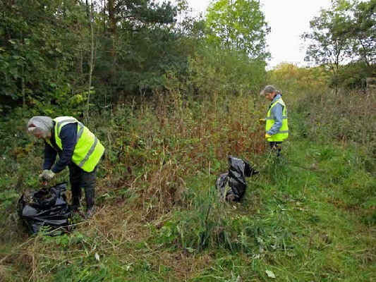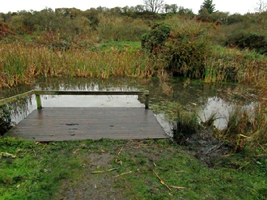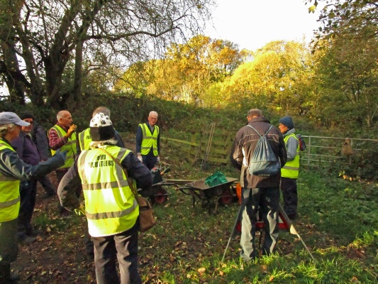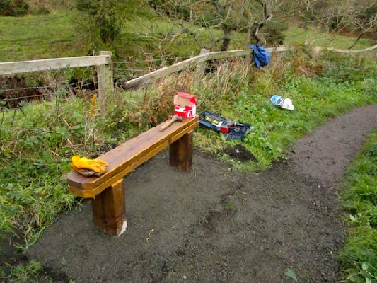 A select squad of nine volunteers assembled at Hartley Lane carpark today for a morning of pond clearance, fence maintenance and the installation of a waymarker post and a new seat. The weather was bright and cold at first, but soon turned overcast and drizzly, albeit milder. It was wet underfoot.