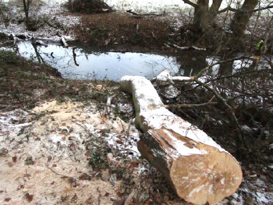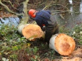 Some of this monster had already been cut up and taken away for firewood. The chainsaw was deployed to dismember it. Next, the two manual winches were attached to the trunks of suitably located trees and used to inch the logs up the bank and away from the river – good exercise on a cold day. I pile of huge logs was on view at the end of the task.