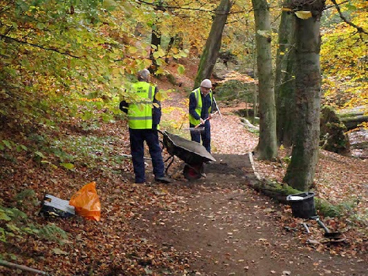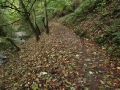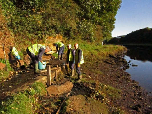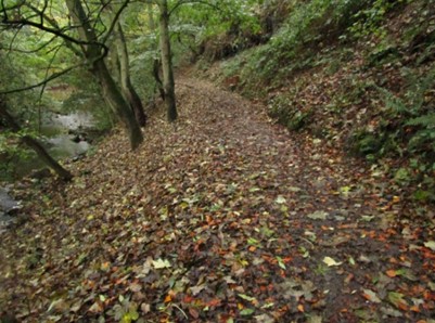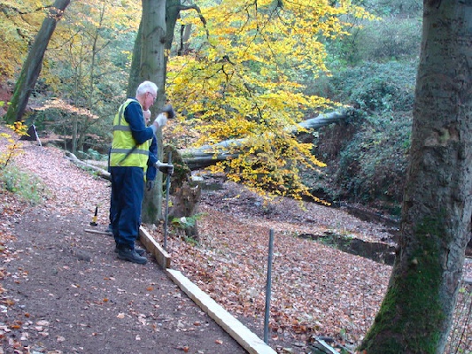 A rather depleted working party of six met today to carry out path repairs upstream between the two bridges. The weather was damp but mild for late October. The path was covered in fallen sycamore leaves and the atmosphere in the Dene was calm and tranquil.