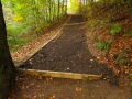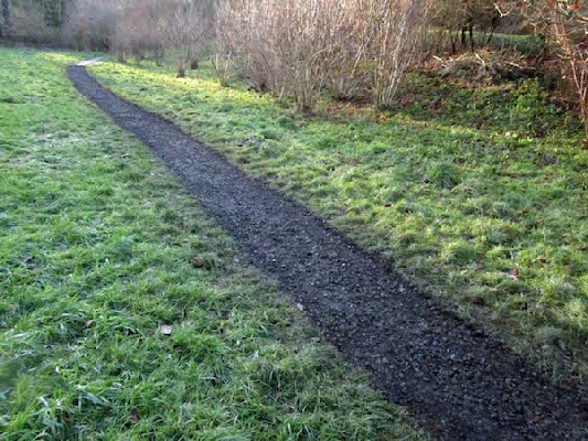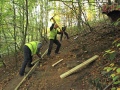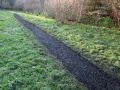 In a bit more detail, the steps were: (1) set edge timbers in place and secure with metal spikes hammered into the ground; (2) dig out the uphill side of the path and spread the material evenly across the path surface; (3) install “stoppers” – timber cross-pieces designed to stop path material from running downhill – across the path in the steeper sections; (4) bring road-scrapings material down by wheelbarrow; (5) spread it on the path, and rake and compact it.