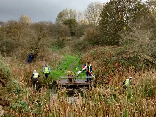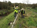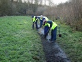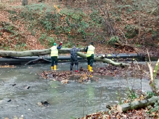 A work party of 10 gathered at Crowhall Farm on a winter’s morning to tackle the branches in the river that were left over from the 28th November. After a 10 minute walk we reached the area – between the embankment tunnel and Holywell road bridge – and were split into two teams. One was tasked with clearing the gullies of fallen leaves in the area; the other started on branch removal.