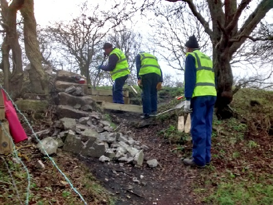 A work party of eleven met up at 8:30 on Millfield, Seaton Sluice, to sort out the wagonway steps above the Pipe Pond. The weather was fine, if cold. I think the sun went in while we were working, but we were too busy to notice. The ground underfoot was moist but not too wet.