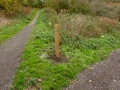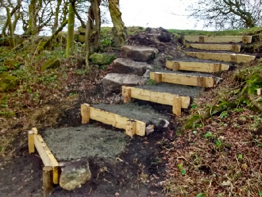 If you have been following these reports, you will remember that a fallen tree had to be sorted out on 22nd August. Well, that tree destabilised the kerb-stones along the edge of the path at that point. Today that problem was rectified: the kerb-stones were buttressed with timber stakes and some tread stones were put in place to make the path more usable at that point.