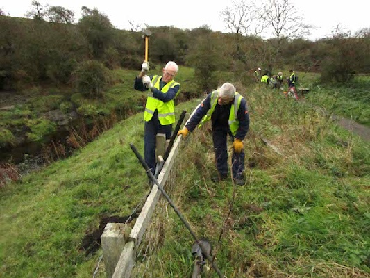 The first group then their turned their attention to the fence that runs along the side of the burn in that area. Its purpose is to keep cattle from crossing the burn from the field on the far side and clomping about in the wild area on the south bank (the old Grove Farm area) which we maintain. Ideally, the fence should be replaced, because it is leaning over in several places and some of the uprights are rotten at the base. However, with our limited resources all we can realistically do is repair it. This we did, by reinforcing the uprights with new posts, hammered in and screwed on.
