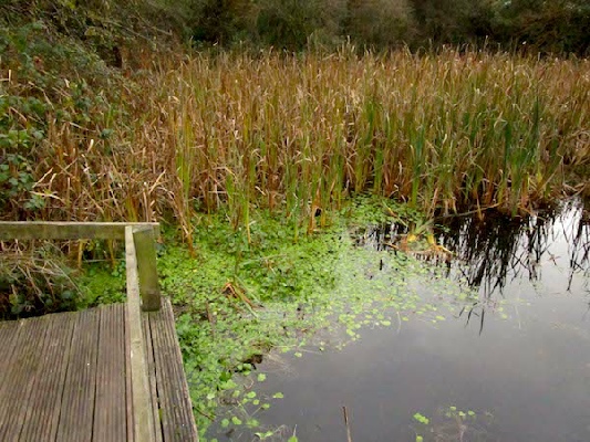 The second group – the “lucky five” – spent the morning enjoying the marsh-gas smells and mud of pond maintenance work. The dipping pond (so called because of its pond-dipping platform) is close to Hartley Lane carpark, and supports a wide range of wildlife, from dragonflies to frogs, toads and newts, and from a wide variety of pond plants to moorhen and visiting mallards. It suffers from two encroaching pond species, however: (1) reedmace (bulrush, Typha latifolia), which is native but very spready, and (2) floating pennywort (Hydrocotyle ranunculoides) an invasive alien from the Americas which spreads over the surface of the water.