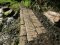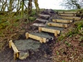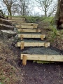 Next, a series of retaining timbers was set into the slope alongside the old steps, secured with screws to heavy wooden pegs hammered in, two per retainer. Meanwhile, the space behind the retaining pieces was filled in with sandstone blocks, concrete rubble and soil, then surfaced with aggregate. The soil was taken from a well-chosen spot where we found some soil with a high gravel content. The aggregate had to be – very laboriously – wheelbarrowed from a distant pile and carried up the steps from the Pipe Pond in buckets.