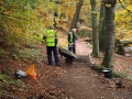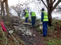 Initially we split into four teams. Teams 1 and 2 went off to remove ivy from some of the mature trees on the bank adjacent to and above the tunnel over the burn. Although ivy has a bad reputation, it is not a parasitic plant and does not damage trees as a general rule. However we have to consider the site of the tree and the potential for it to be brought down causing damage to footpaths, bridges, tunnels, etc., if it were to be felled by the weight of the ivy in strong winter winds. A section of all stems around the circumference of the tree is removed and the top growth is left to die back naturally. This is not as easy as it sounds when the tree is on a steep bank sloping down to the burn, which means balancing at an unnatural angle whilst hanging sloth-like on to the trunk with one hand and sawing the ivy stems with the other. One volunteer used an old fence for balance and support, but unfortunately it gave way and they ended up flat on their back amongst the ivy and brambles. As I said earlier we’re made of stern stuff, so no damage done, apart from a little hurt pride.