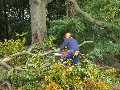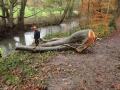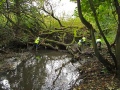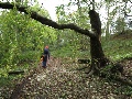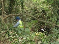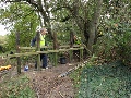 Five of the volunteers took the chainsaw, winches and other tools upstream to the giant beech about halfway between the tunnel under the old railway line and the Holywell road bridge. This tree, which is just by the path, must be the oldest and biggest in the Dene. Several months ago, in a strong wind, it had cast a branch so huge that it looked like a tree itself. This had crashed right down into the burn.