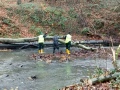 Two winches were set up to tackle the heavy work of pulling the branches out of the river. To achieve this a member of the work party had to pull on a pair of waders to brave the chilling water of the river to attach a strap around the branch. The winch wire was then fixed to the strap to commence pulling the fallen branch up the river bank, making sure it did not roll back into the river. This process was repeated throughout the morning, carefully picking which branch was to be removed next, and making sure they were stored safely on the river bank.