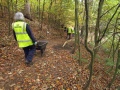 Team 3 made their way down the bank on the Holywell side of the Waggonway, with the intention of removing some obsolete fence posts. This proved not to be as easy as they had hoped, as the posts had been cemented in. The fence was a remnant of the barriers put in place years ago, when the cattle had freedom to roam around the dene but had to be prevented from getting out onto the road. A sledgehammer was used on the concrete for the first three posts, but as they were to be reused later on in the morning and some shorter ones were needed, the rest were sawn off.