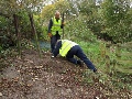 Team 4 set about the more technical task of the day replacing a fence which has been broken a number of times. Since the council built a kissing gate at the point where the path coming from the Holywell road bridge meets the Waggonway, breaking the fence has given cyclists a quicker exit. The old damaged posts and fence were dismantled and the area prepared for the construction of the replacement using the posts salvaged by team 3. Holes were dug and to provide extra strength and stability, posts were cemented in with rapid setting cement. Rails were put in place and the pièce de résistance, in the form of rigid metal mesh, was attached. The construction is lower than the previous one, so hopefully cycles will be lifted over it rather than breaking down another area of fence.