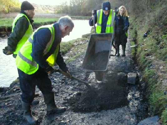 While four volunteers were doing this, the other five were digging out one of the cross-path gullies. A length of plastic pipe was laid in the trench which was then filled in and paved over with stones from the river.