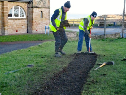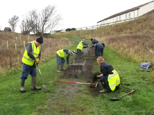 A good turnout of 11 volunteers assembled near St. Paul’s church in Seaton Sluice this morning to continue the path work of a fortnight ago. Last week was another wash-out and in fact we have had an unprecedented four cancellations because of rain during November and December!