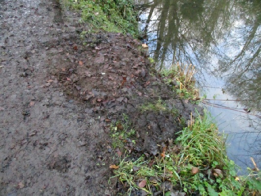 So, what we do is (1) hammer a post into the river’s edge at the dog slide, (2) pack lengths of planking behind it to make a barrier, and (3) fill the space behind with soil. And that’s job done, until the next dog slide appears!
