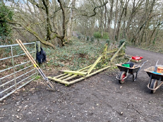 Three of the volunteers went to the kissing-gate off the old railway line that the youngsters use to access the mountain-biking area. Their job was to repair the nearby fence which has recently been vandalised by unknown individuals. Tools required were heavy-duty fence-post auger grabbers, a posthole digging spade, a drill, an impact driver and some screws.