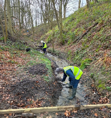 So, it was into the water in wellies to clear all the junk out of the stream with spades. This took quite a while to do, as there was a lot of debris to be shifted. Some litter was removed as well. A couple of logs had to be sawed in half to get them out. A small dam was dismantled also. By the end, the water was flowing nicely.