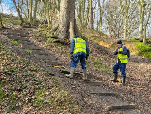 Meanwhile one of the timber steps in the flight leading up the slope to the west had to be replaced. It was dug out and a new one put in place, with stakes to secure it.