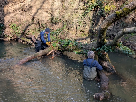 So, we got the loppers out and a long-handled pruner and started work. One of us got into the river with waders on to tackle the overhanging branches.