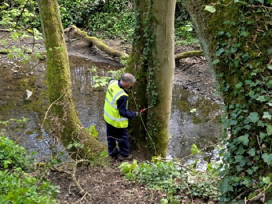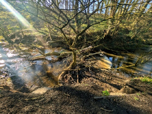 Storm Dave had done its worst and blown two trees into the river. The first one was just upstream of the waterfall. We couldn’t get the main trunk out, but, after removing branches, we winched it to the side of the river. The river is not all that deep at that point so waders weren’t needed (although wellies were).