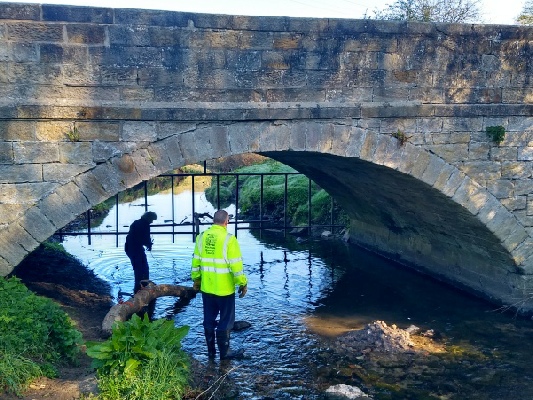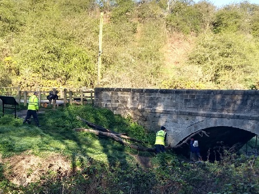 The team leader has spotted a couple of river blockages near the Holywell road bridge. So, after loading up the wheelbarrows, off we went down to the old Holywell bridge and over to the south side, then along the downstream path to just before the first flight of steps.