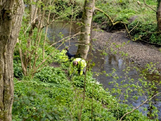 A working party of nine volunteers gathered near Hartley West Farm this morning for another river clearance session, on a fine sunny day – with birds singing and spring flowers blooming.
