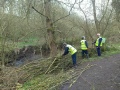 The willow pruning and weaving proceeded well, and meanwhile we started to tackle a minor logjam somewhat upstream of the willows. A heavy waterlogged branch was partly block the stream, and after some bowsaw work a group of us pulled the branch out onto dry land.