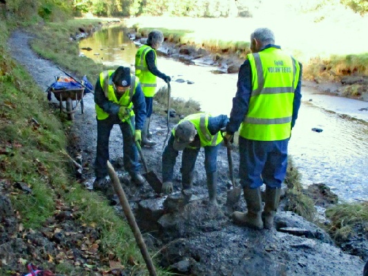 This work was done by a group of three volunteers. The other six meanwhile set to work clearing out the gully or small ditch running down one side of the Hartley West Farm access road where it comes down a steep bank. Mattocks and spades were the main tools used.
