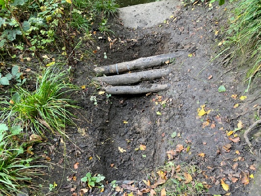 Memories of the dry months of the 2025 summer are a fading memory now, and the theme of today was mud – wet, sticky mud. Indeed the whole idea of the project is to combat mud and improve the walkability of the estuary path. The problem is that there is a steep slope above the west-side path, which means that when it rains, water pours down onto the path making it muddy and puddley.