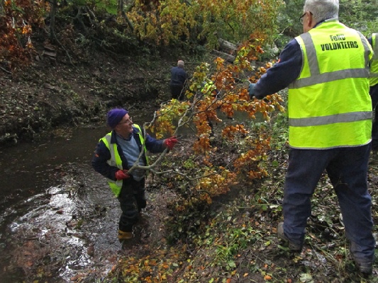 Task 1 was to remove the barbed wire from the cattle gate under the stone bridge on the Hartley West Farm access road. Barbed wire is put on every spring to keep the stock from wandering up the stream and into the reserve, and has to be removed every year at this time to stop logs and branches, which tend to come down the river in winter, from snagging on the cattle gate. Hardy (or foolhardy) volunteers in waders attended to this task.