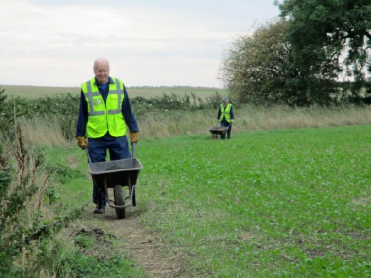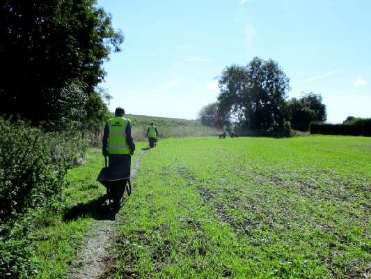 Where does the aggregate come from? Well, there’s a tale! Three dump-bags of aggregate had been delivered to a point in a nearby field some time ago, and all that was needed was that they be conveyed to the dene top nearby the site. The only slight problem was that when the local farmer – who volunteered to do this for us – tried to lift them with his tractor, they broke open. Plan B therefore had to be rolled out: wheelbarrowing the material from the dumping site to the work site (see photo) – a long way! In fact more than half the volunteer effort went into this activity today. Never mind, it was good exercise!