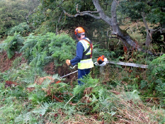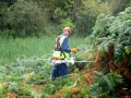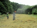 So, we got another strimmer fired up and tackled it with that, hoping that this will knock it back and open up the pond a bit. After this, the fourth strimmer was employed strimming out a gully then helping with clear the bracken on the mound.