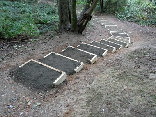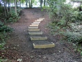 Well, partly because of the expenditure of effort on wheelbarrowing, it was only possible to put eleven steps in today (see photo). Nevertheless we got a few “thank-yous” from passers-by, although not so many from mountain-bikers who seem to enjoy going up and down these steep slopes – but they can still pass either side of the steps.