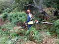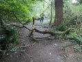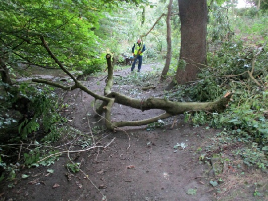 The other three volunteers met up at the Crowhall Farm gate to sort out the big fallen ash branch that was across the path near the Rest-a-While bench by the riverside up from the waterfall. This had already been partially cleared by one of the volunteers on Sunday. On arriving at the scene, they set up the trusty winch, attaching it to a tree at one end and the branch at the other. The branch was soon pulled clear. Meanwhile the lesser branches were being cut off the main branch and dumped on the ground nearby.