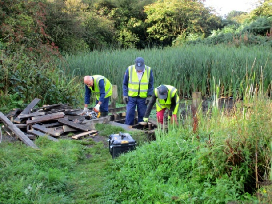 The activities of the Tuesday working party centred around the dipping pond near the Hartley Lane carpark today – strimming, removing the old pond-dipping platform and reed control.