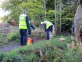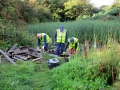 The second team, of eight people, strimmed their way through the tall herbage to the lake edge on the field side to see if there was any balsam. There was: lots! There was a particular concentration around the old viewing screen at the outlet end of the lake, but there were also colonies right along that side of the lake. These were tackled by removing seed-heads, then pulling the plants and crumpling them.