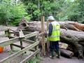 Anyway, the party split into three groups. The two volunteers making up the first group went, pushing a wheelbarrow of tools, to the site of the damaged fence. This was by the side of the disused railway line between the humpback bridge and the embankment over the tunnel. The fence had been demolished by a falling tree in November and had been patched up several times since then, but was proving an ineffective barrier against the mountain-bikers.
