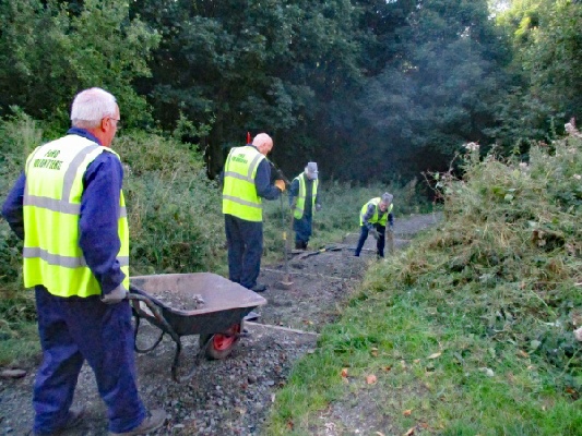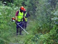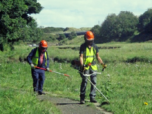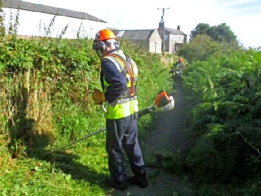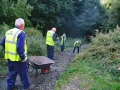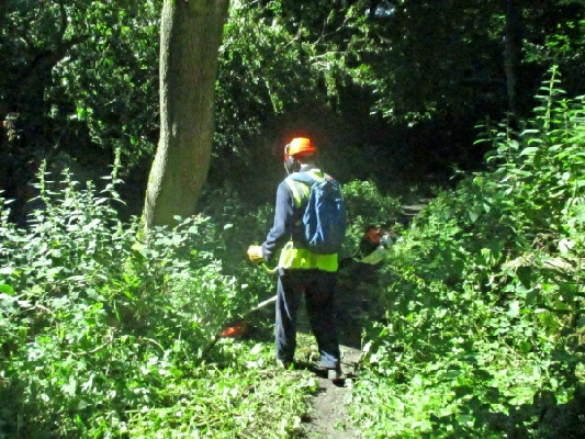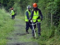After getting kitted up with strimmers, rakes, loppers, warning triangles, petrol cans etc, we split up into three pairs of strimmer/rakers and spread out along the pathway.
