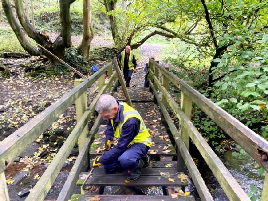 Only four volunteers turned up today at the metal gate on the Hartley West Farm road due to a mixture of holidays and grandchildren babysitting duties on an autumnal morning for bridge and fence repairs. After a quick chat on the tasks to be tackled and any safety issues, off we went with two wheelbarrows full of tools and planks of wood on shoulders of the other two volunteers.
