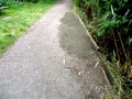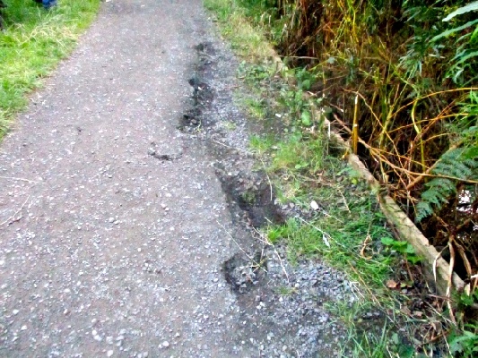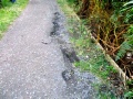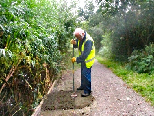We fixed this problem by filling in the holes with aggregate and levelling off to the general path level. This took about ten wheelbarrow loads of aggregate, which had to be brought from the pile near the Hartley Lane carpark. This was the hard-labour part of the job! A piece of timber was inserted at the edge to reduce the risk of path material slipping into the river. Then the new material was tamped down. Job done!