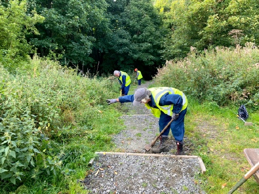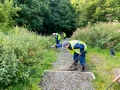 A party of seven volunteers met at the end of Wallridge Drive near the gas pumping station on a lovely late summer’s day for a morning of strimming and working on the steps we installed recently at Concorde House.