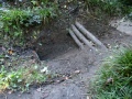 Three of us went over the bridge to the other side of the burn to tackle two jobs. The first of these was removal of a large fallen branch from the path just downstream of the Rest-a-While seat. This was accomplished with bowsaws, loppers and a bit of muscle power. The second job was to clear the blockage from the gully under the path close to the upstream footbridge. This involved digging out a lot of the silt that had accumulated in the mouth of the gully pipe.